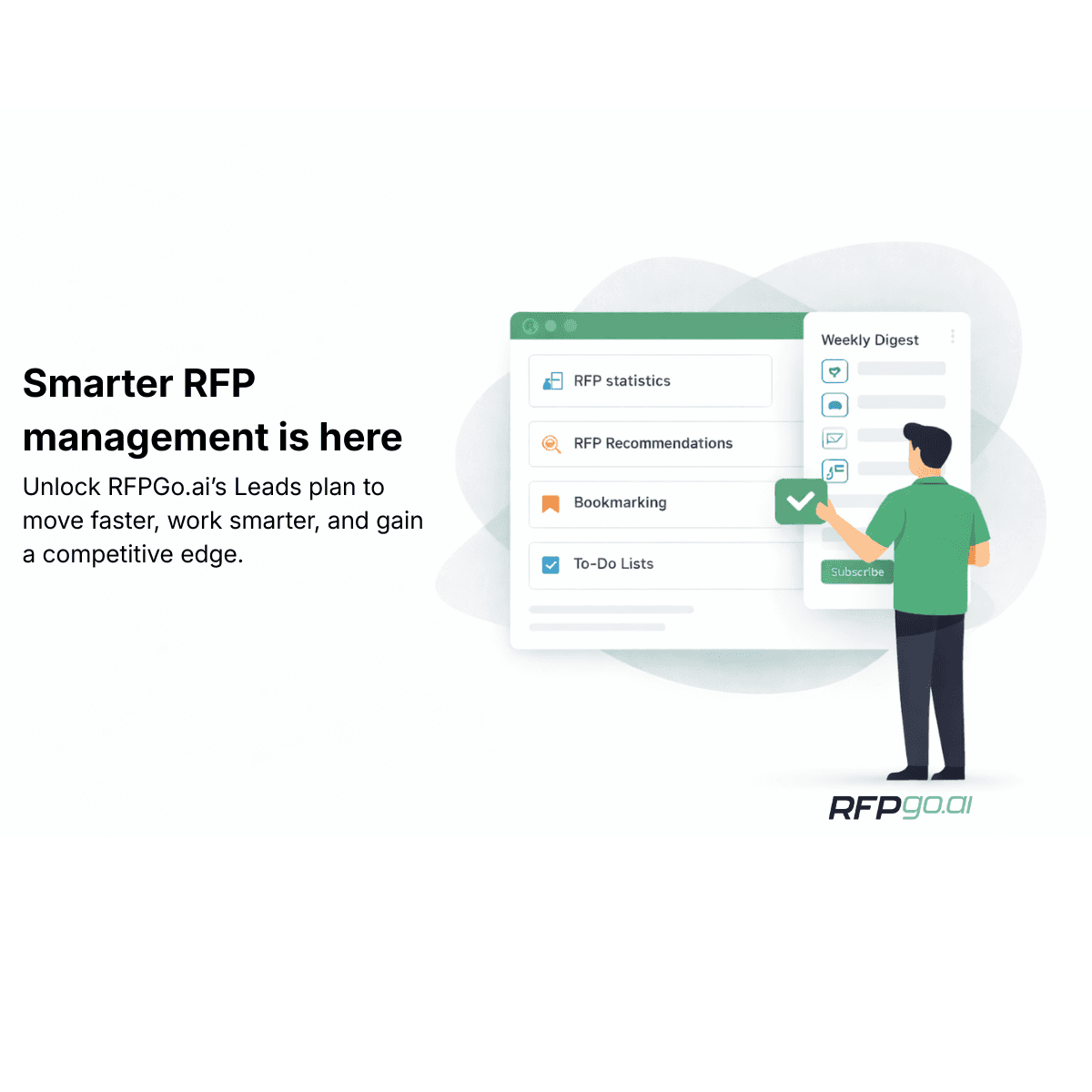 RFPGo.ai is the first end-to-end RFP platform built for small, high-performing teams. It helps you find the right opportunities, quickly understand requirements, and move from discovery to submission with less friction. We offer tiers that meet you where you are—starting with Leads for streamlined RFP discovery, and expanding to Leads Plus (coming soon), which adds AI to turn dense solicitations into clear summaries to aid bid/no-bid decisions, and the ability to kickstart responses with outlines and drafts. As we continue building, you’ll see additional tiers that support faster workflows, better collaboration, and stronger proposal outcomes. To stay informed, consider signing up for our newsletter.