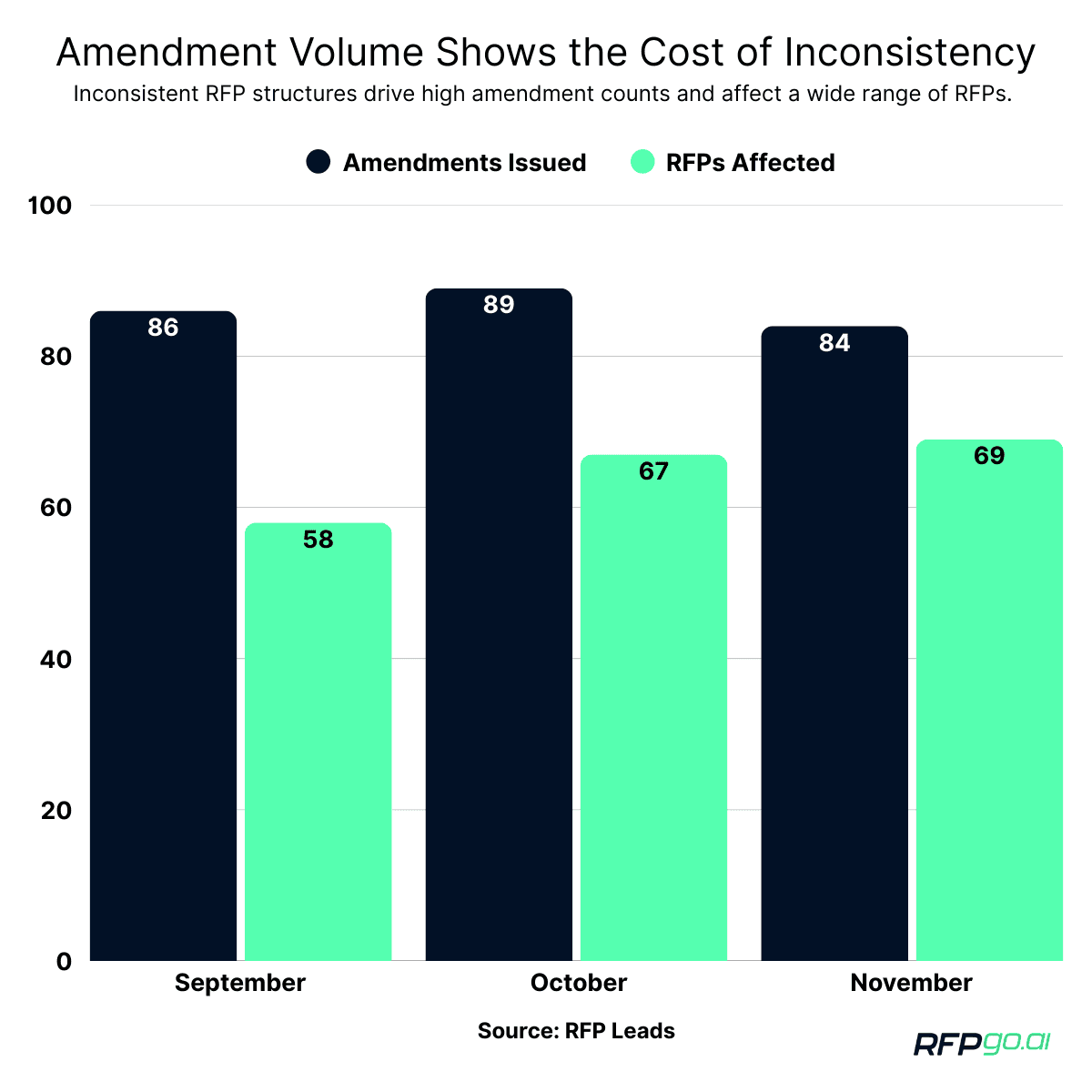 At RFPGo.ai, we review hundreds of government RFPs each month. One aspect that rarely receives attention but has significant process implications is amendment activity. When we analyzed amendment activity across September, October, and November, one structural pattern became unmistakable:
